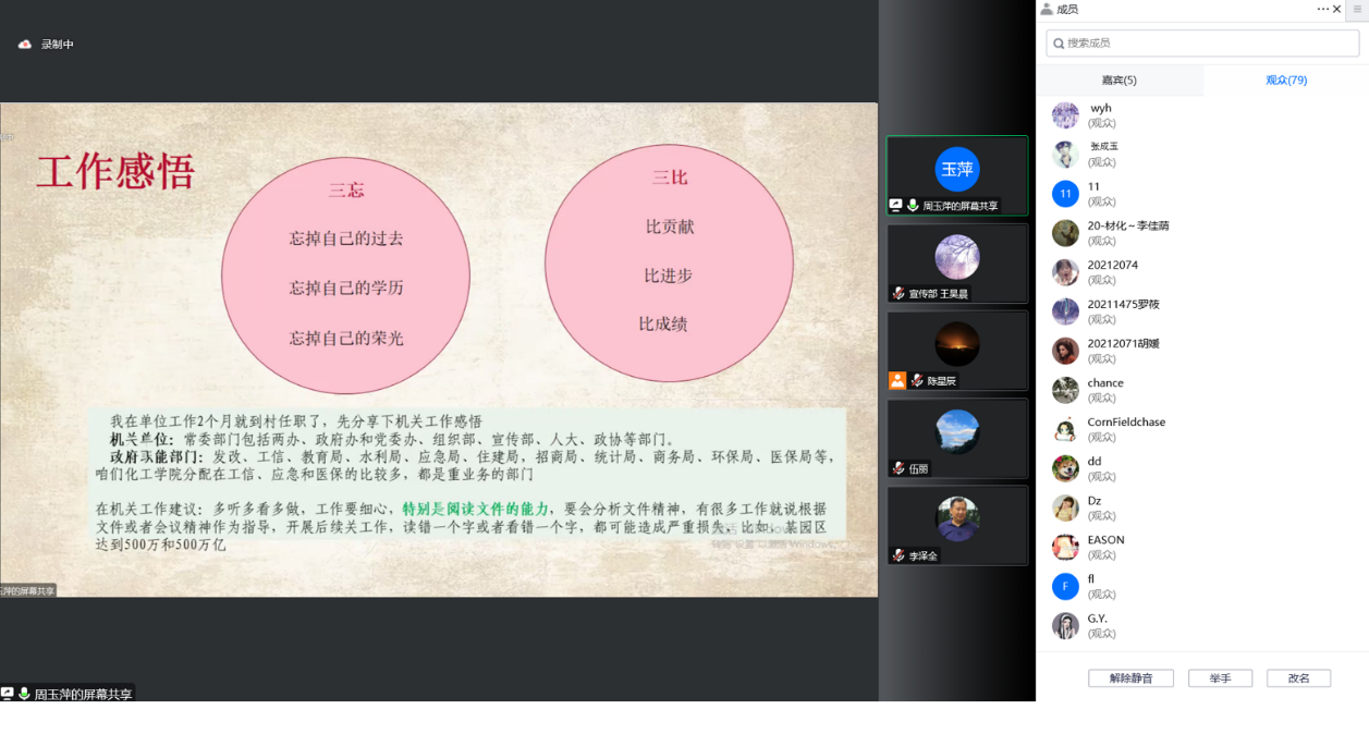 接着,周玉萍学姐向我们介绍了她考入选调生后的工作经历。她被分配到大寺镇大寺村担任党支部书记助理,和村干部一起入户调查,组织村民举办红色文艺活动,以及开设党课宣传党的精神。从最开始的陌生到现在逐渐亲近,她将自己的青春献给基层,全心全意建设好美丽乡村。